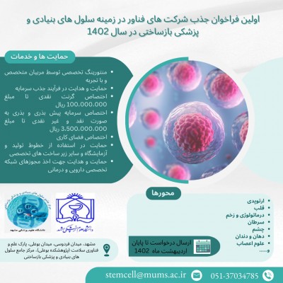 فراخوان و اطلاعیه ها 06 ارديبهشت 1402 بازدید: 107 فراخوان جذب شرکت های فناور در زمینه سلول های بنیادی و پزشکی اولین فراخوان جذب شرکت های فناور در زمینه سلول های بنیادی و پزشکی بازساختی در سال 1402